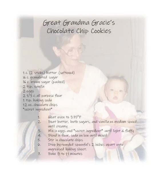 Graced Glow was created in honor of my Grandma Grace; lovingly “Gracie". A woman remembered for her love for her family, her faith, and her unforgettable sweet treats. She always had a way of making people feel cared for, often with a smile and a chocolate chip cookie made with her “secret ingredient”.